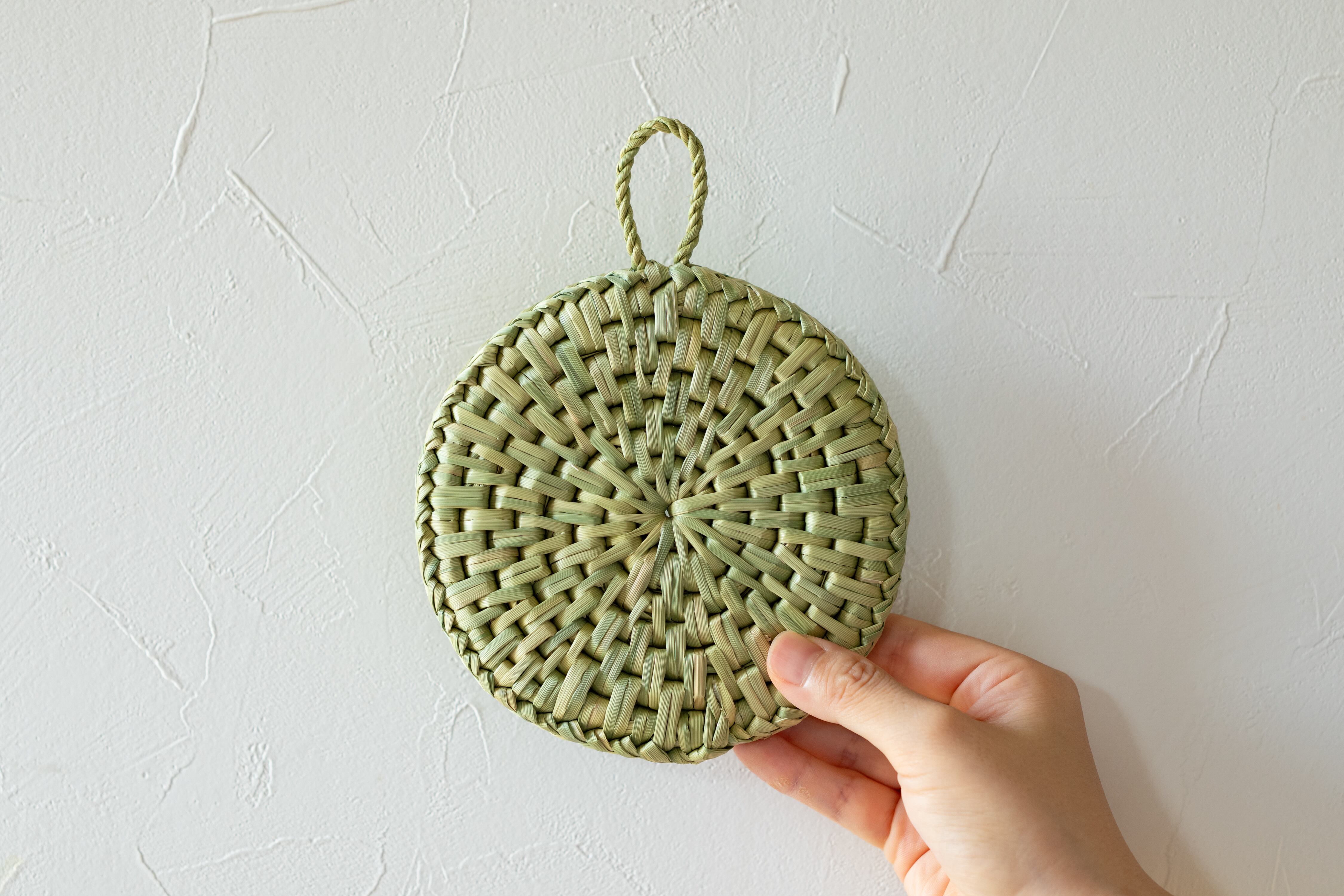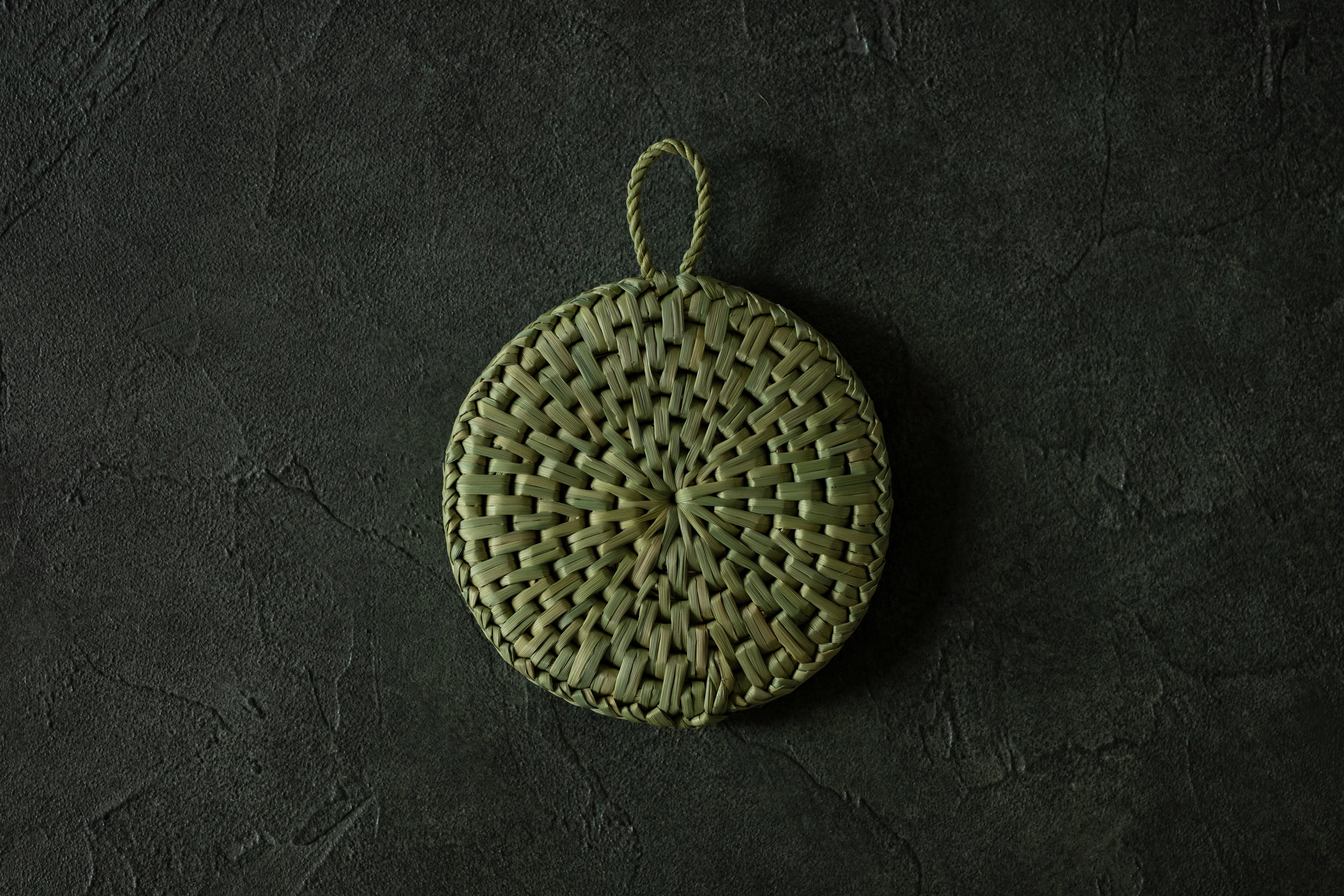 稲の成長過程で最後に出てくる稲穂を支える部分は、わらの中で最も強くて美しい素材になります。その部分のみを使用してコイリング という技法で仕上げたわらの敷物です。加工を施していない無垢のわらですが、光沢があるほどに艶やかな印象であることが他のわら細工にはない特徴です。
